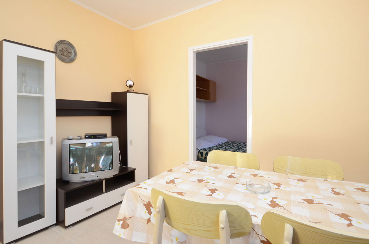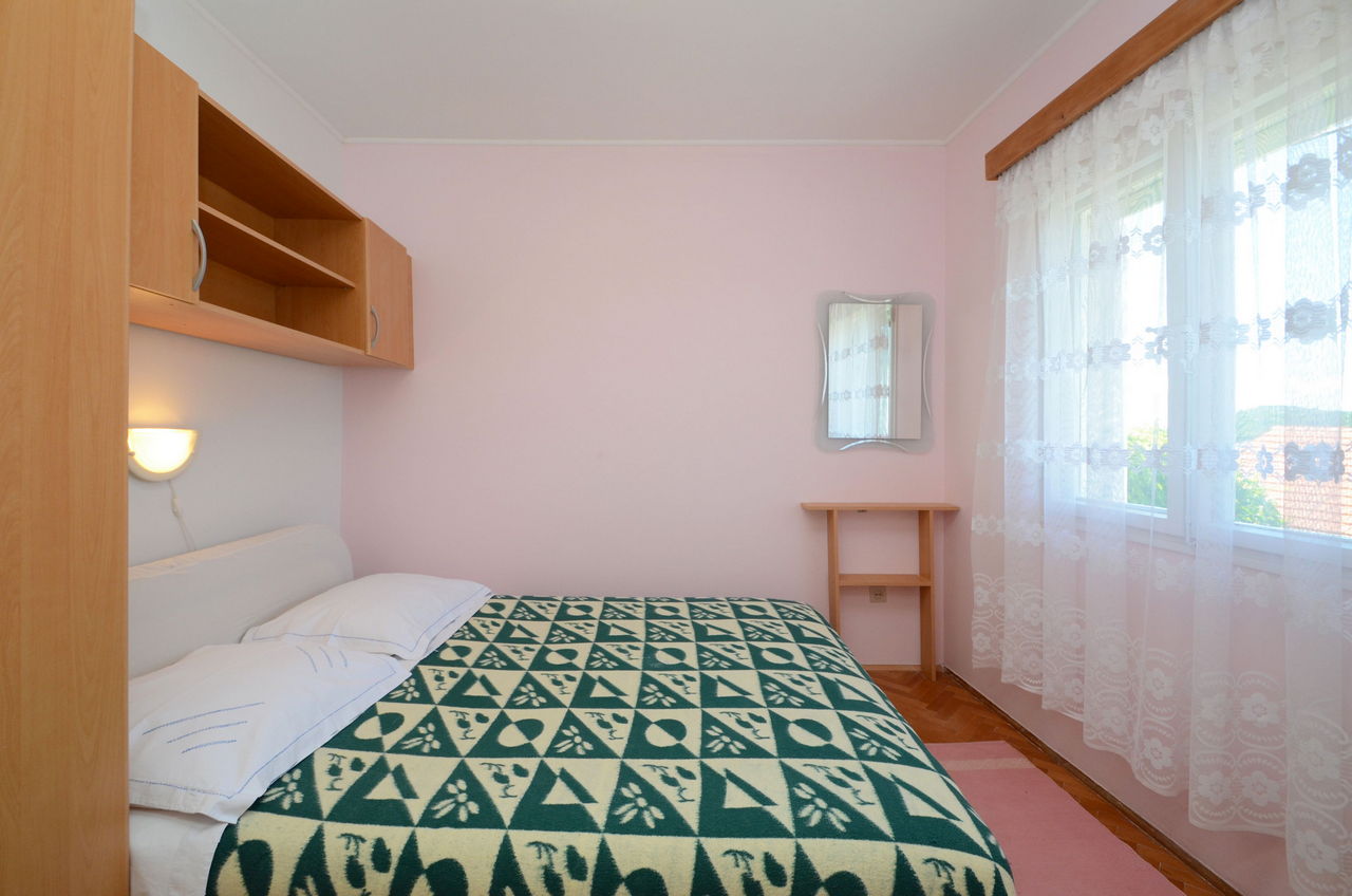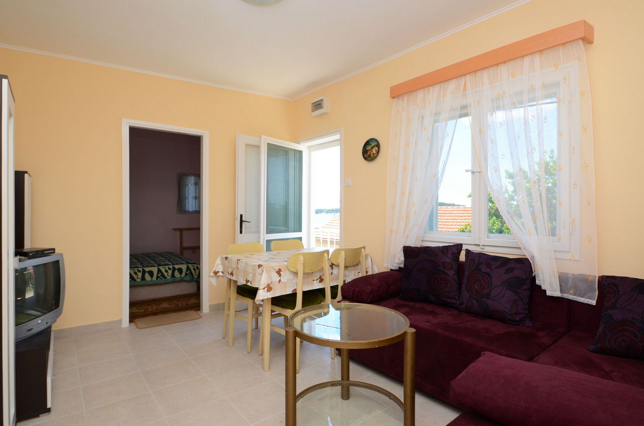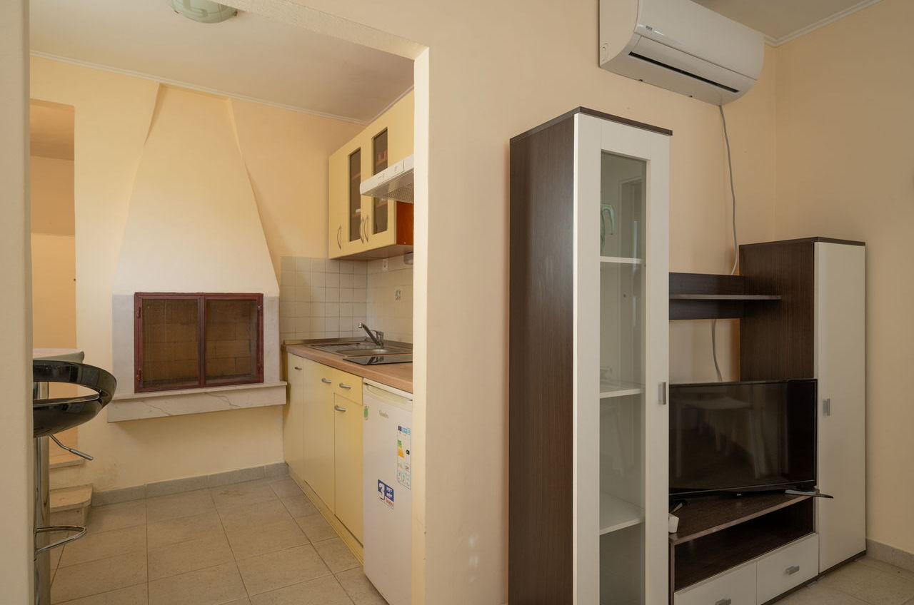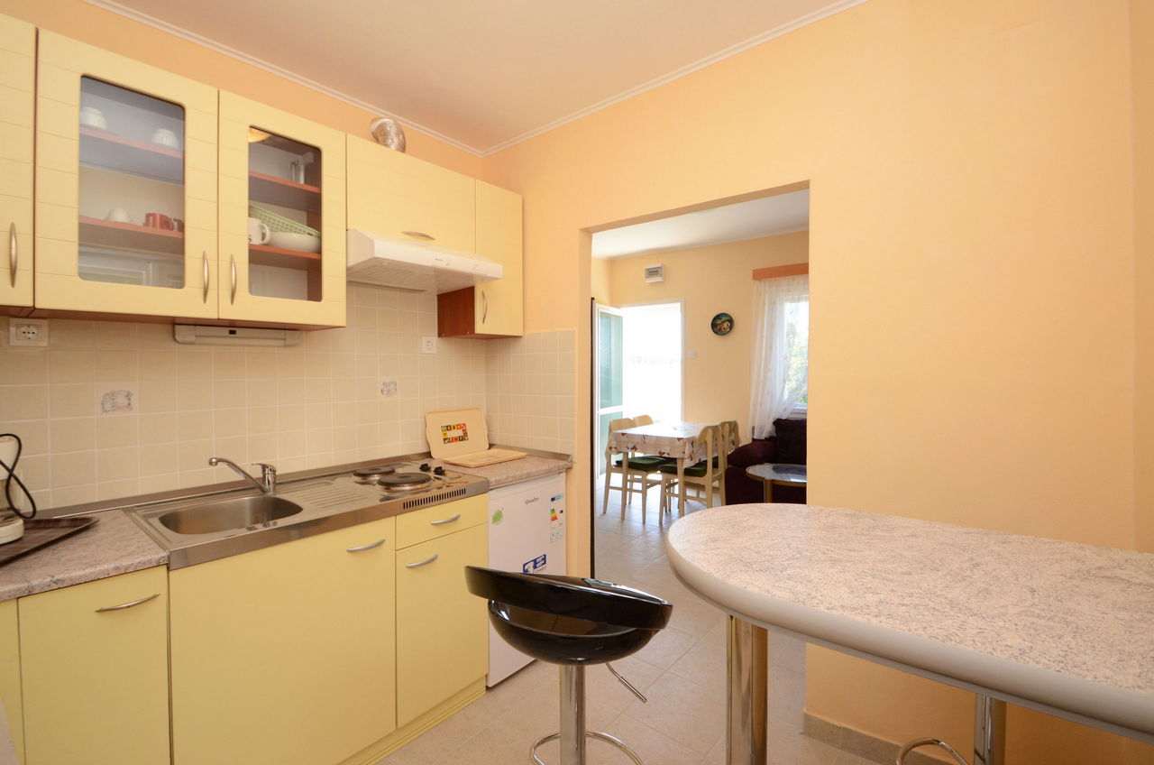 | Ovaj apartman je za 2-3 osobe. Nalazi se u odvojenoj kući koja je bliže moru. Ima jednu spavaću sobu s dvostrukim krevetom. U dnevnoj sobi je kauč na razvlačenje kao i TV. Apartman ima kupaonicu sa tušem. U apartmanu se nalazi opremljena kuhinja (kuhalo, hladnjak, posuđe). Apartman također ima prostranu terasu s pogledom na more. |