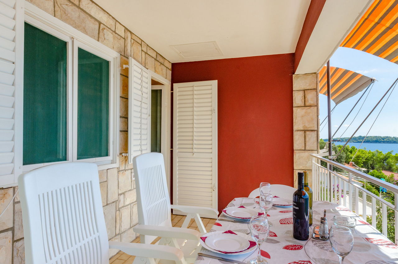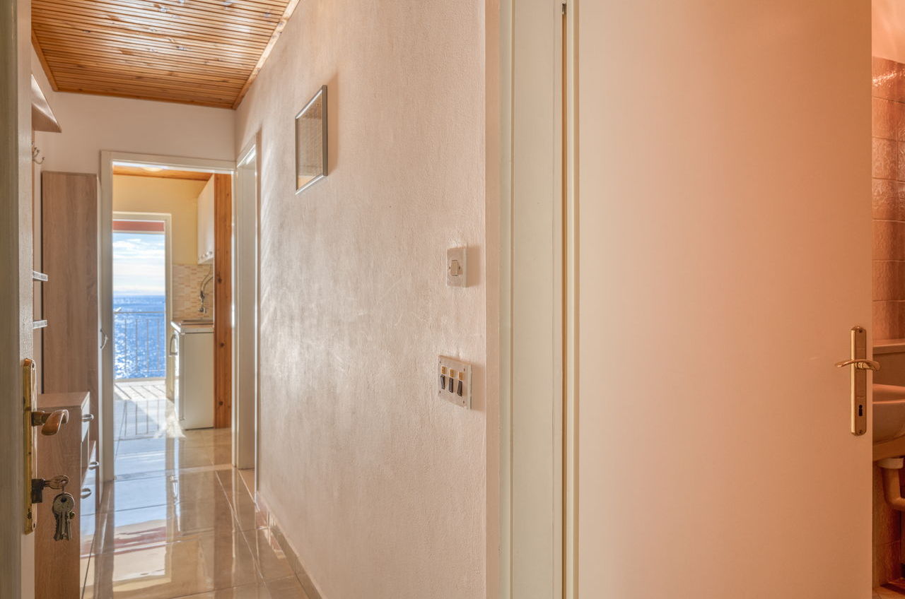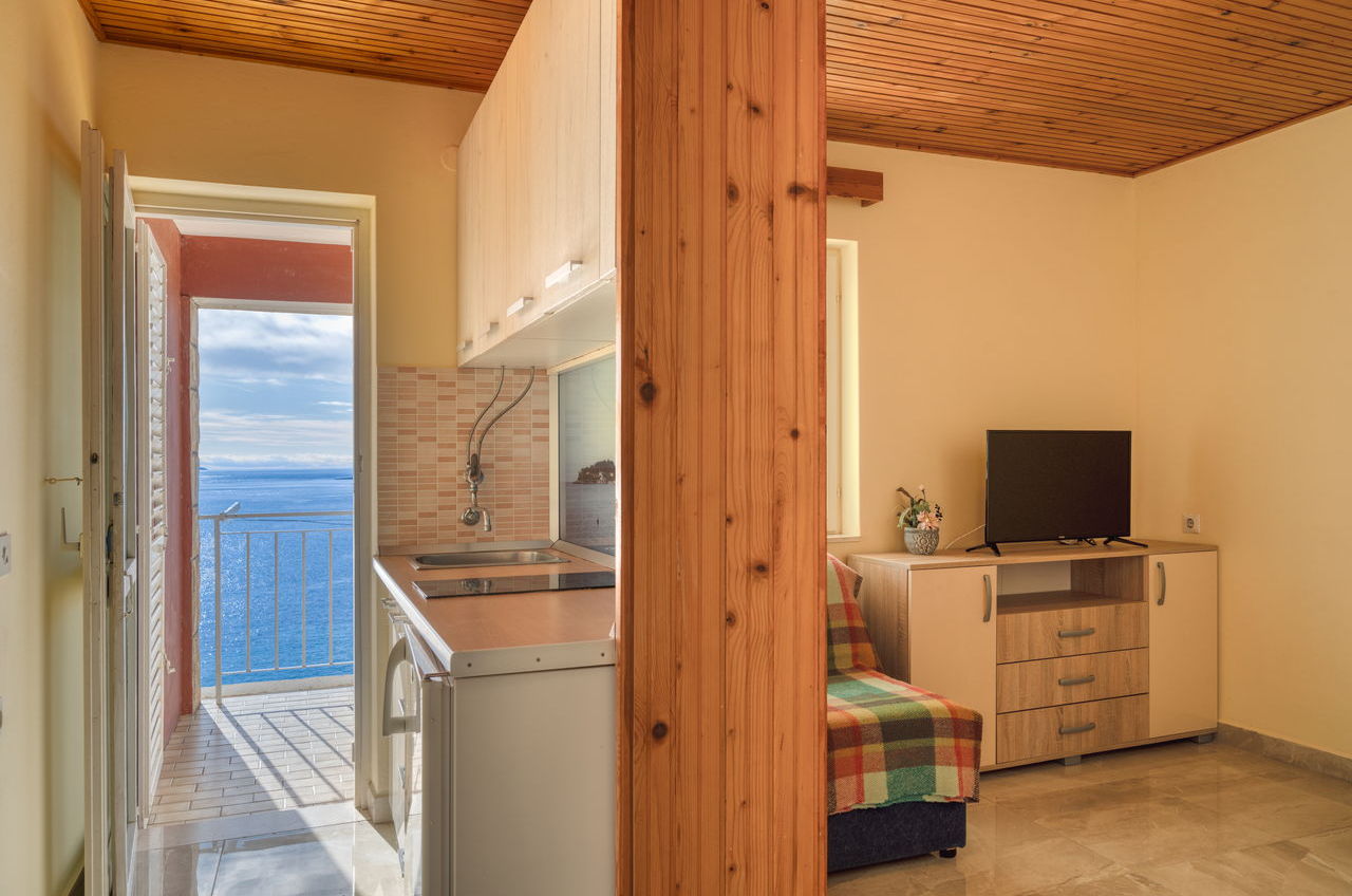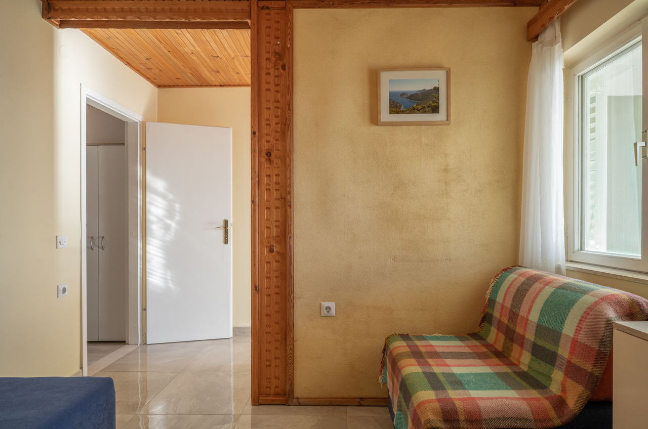 | This apartment is for 4 persons. It has one sleeping room with two single beds and a second sleeping room with a double bed. The apartment has a bathroom with a shower. The apartment has fully equipped kitchen (kitchen with owen, refrigerator, dishes). There is a SAT TV in the apartment. The apartment has a nice veranda-terrace with a view to the sea. |